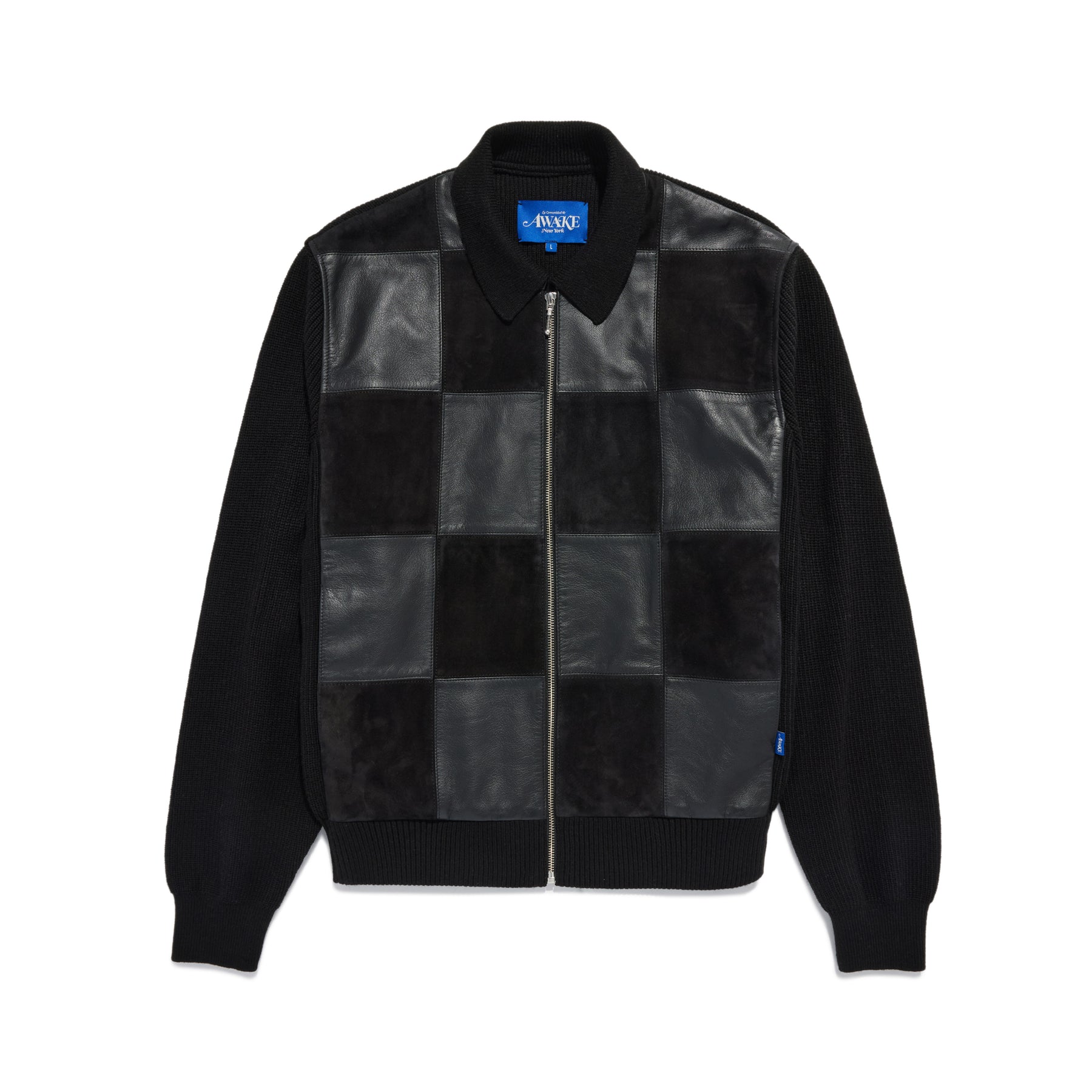Ribbed knit zip jacket with checkered leather and suede patches.